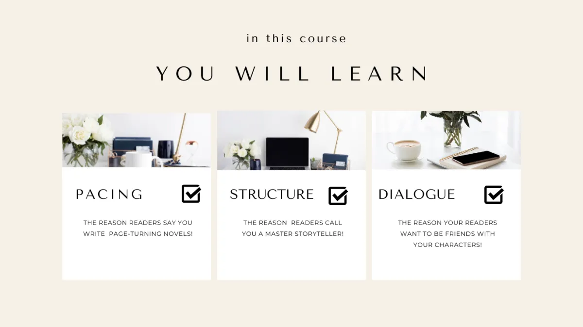 This mini-course breaks storytelling down into practical, actionable steps. You'll learn the method I use to craft openings, chapters,